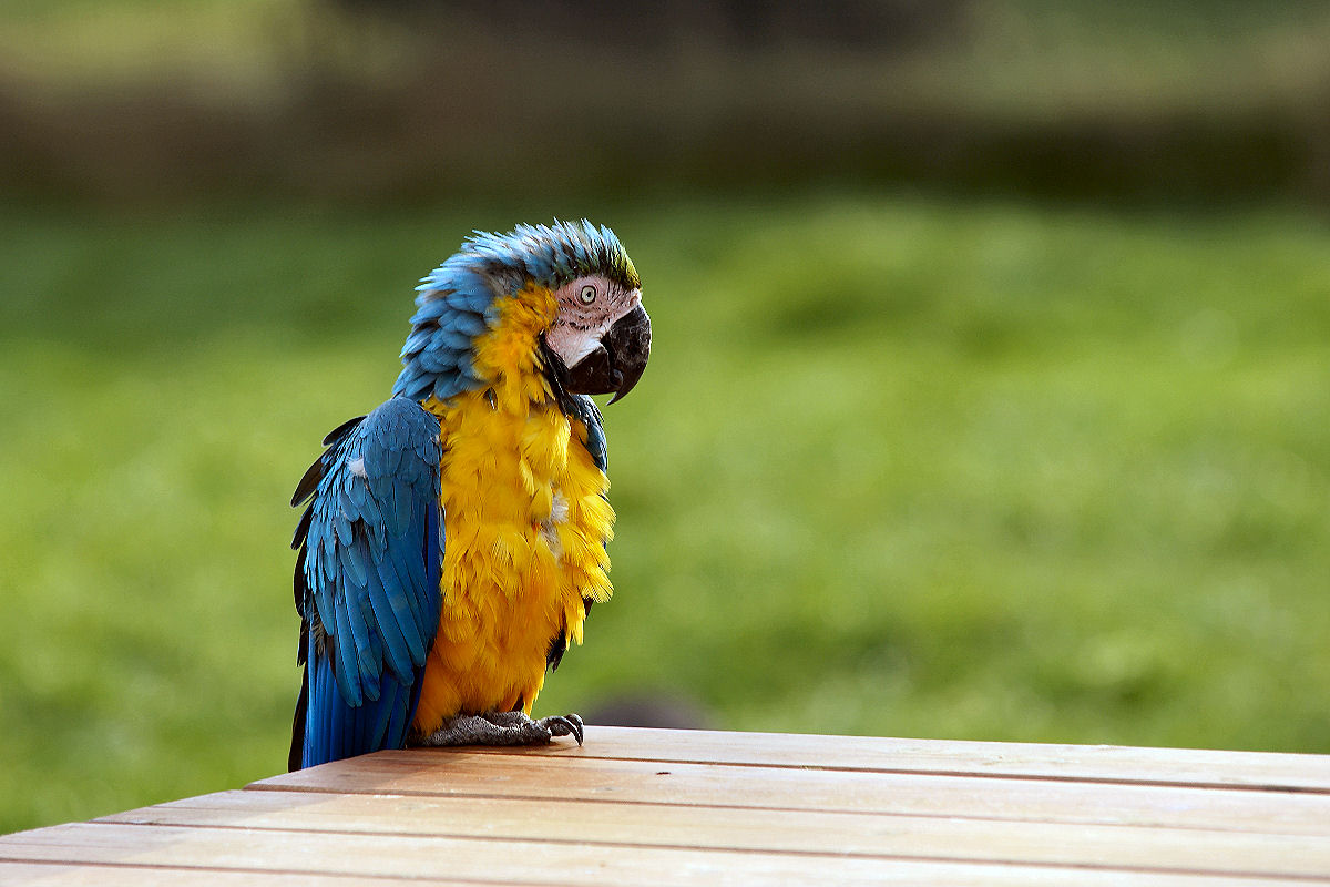 Gelbbrustara sitzt auf einem Tisch