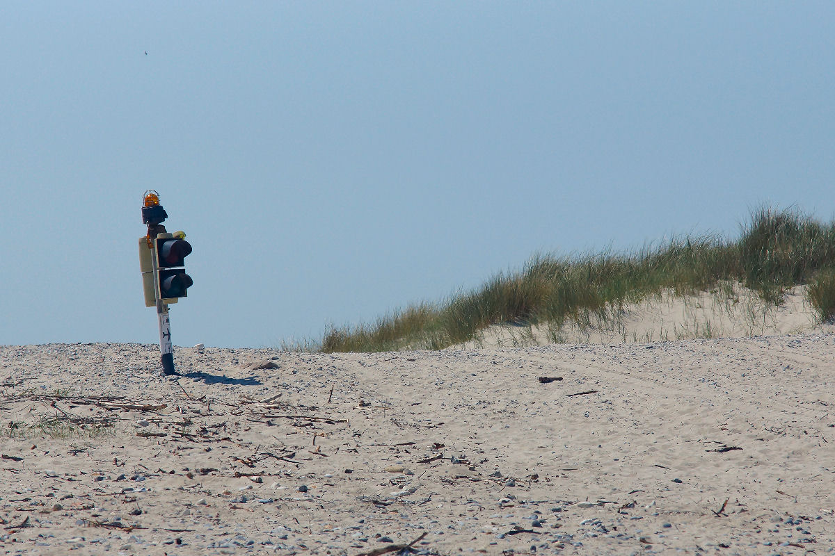 Eine Ampel am Strand ist schon etwas komisch. Nachdem ich die Warnhinweise gelesen habe, war mir klar, warum das autofreie Helgoland gerade am Strand eine Ampel benötigt. Die Ampel steht am Ende der Rollbahn des Flughafens. Startet gerade ein Flugzeug, so ist es gefährlich sich in diesem Bereich aufzuhalten. Daher signalisiert die Ampel, das Fußgänger den Bereich nicht betreten sollen.
